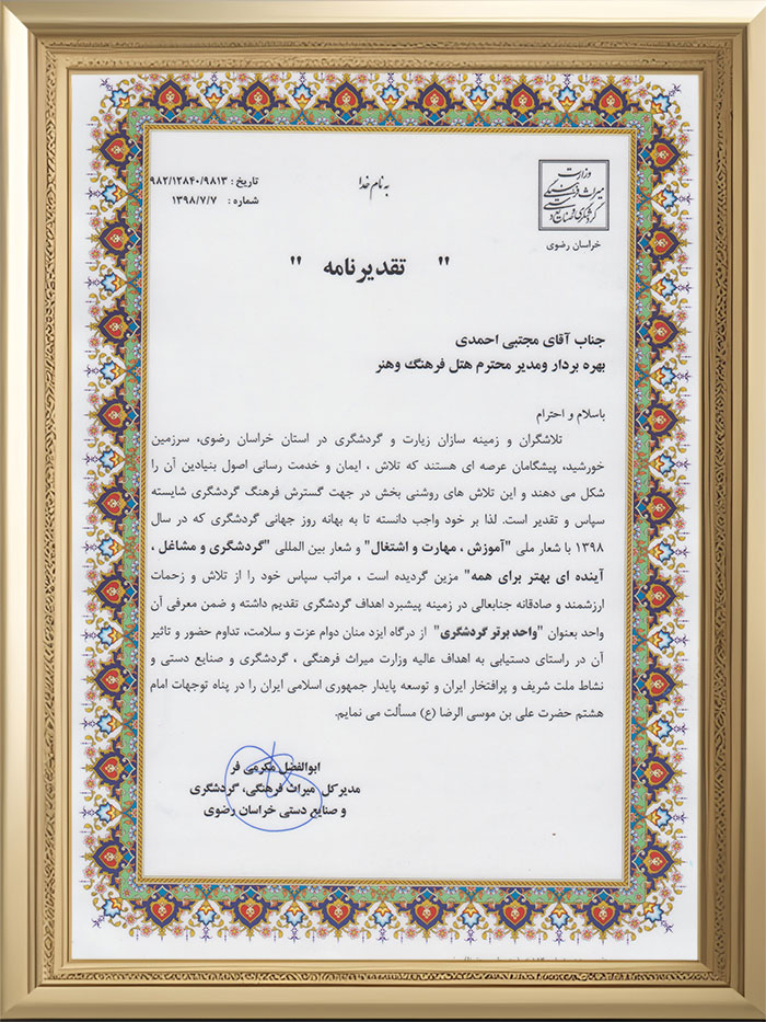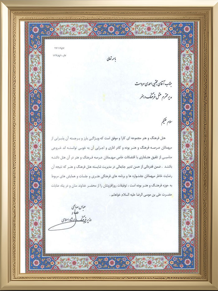 با هدف ارائه خدمت به اصحاب فرهنگ و هنر، هتل فرهنگ و هنر در هشت طبقه احداث و در بهمن سال ۱۳۹۲ افتتاح شد. این هتل در خیابان رازی غربی با فاصلهای در حدود ۱۵ دقیقه به حرم مطهرثامنالحجج(ع) واقع گردیده است. کلیه واحدها دارای امکانات رفاهی از قبیل: سیستم تهویه، یخچال، تلویزیون، چای ساز، اینترنت وایرلس رایگان، حمام، سرویس بهداشتی ایرانی و فرنگی، پک بهداشتی شامل (حوله تن،حوله دست،شامپو،صابون،مسواک و خمیر دندان،دمپایی و...) بوده و میهمانان امکان بهرهمندی از سایر امکانات رفاهی شامل کافی شاپ، رستوران، پارکینگ، لاندری، سالن کنفرانس و… را خواهند داشت.